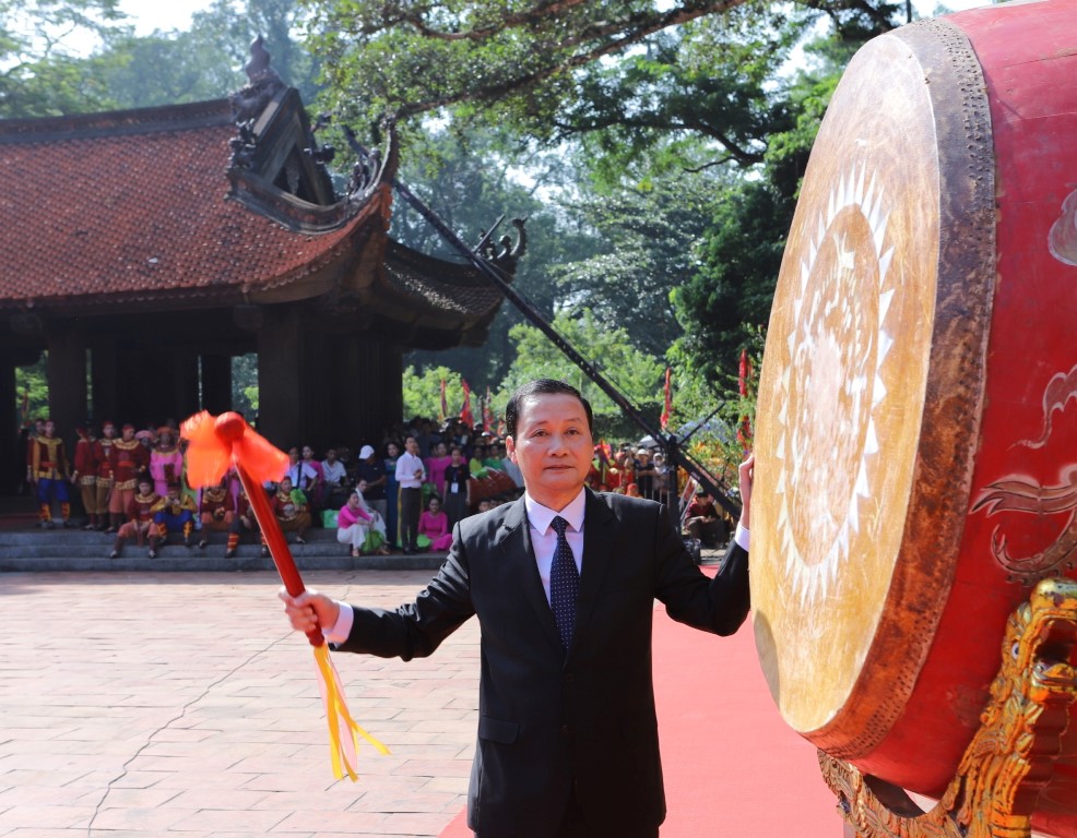 Tiếp đó, đồng chí Đỗ Minh Tuấn -Phó Bí thư Tỉnh ủy, Chủ tịch UBND tỉnh đã đánh trống chính thức khai hội ngày đại lễ tại Khu di tích Quốc gia đặc biệt Lam Kinh.
