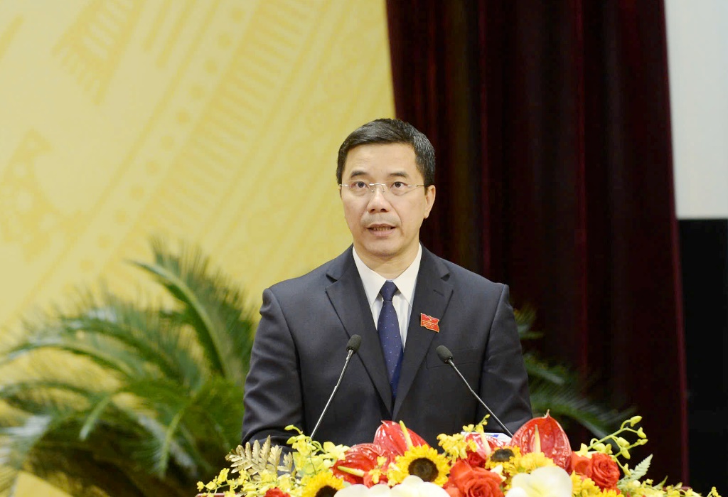 | Đồng chí Nguyễn Hoài Anh, Chủ tịch UBND tỉnh điều hành phần biểu quyết thông qua Báo cáo tổng hợp ý kiến tham gia vào dự thảo các văn kiện trình Đại hội XIV của Đảng. |
