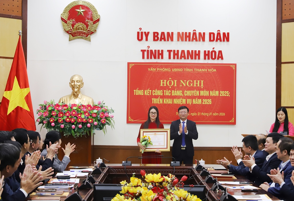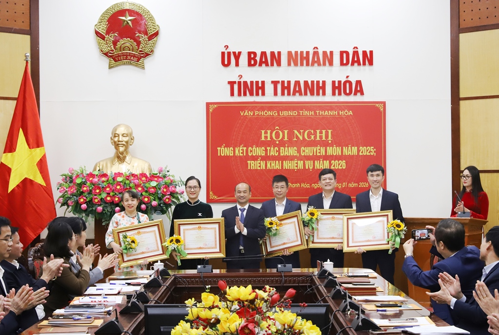 Tại hội nghị, các đồng chí lãnh đạo Văn phòng đã chứng kiến Lễ ký kết Giao ước thi đua năm 2026 của các phòng, ban, đơn vị trực thuộc và trao Huân chương Lao động Hạng 3 của Chủ tịch nước cho đồng chí Nguyễn Thị Minh, Trưởng phòng Hành chính - Tổ chức; trao Bằng khen của Thủ tướng Chính phủ và Bằng khen của Chủ tịch UBND tỉnh cho nhiều tập thể, cá nhân có thành tích xuất sắc trong công tác.