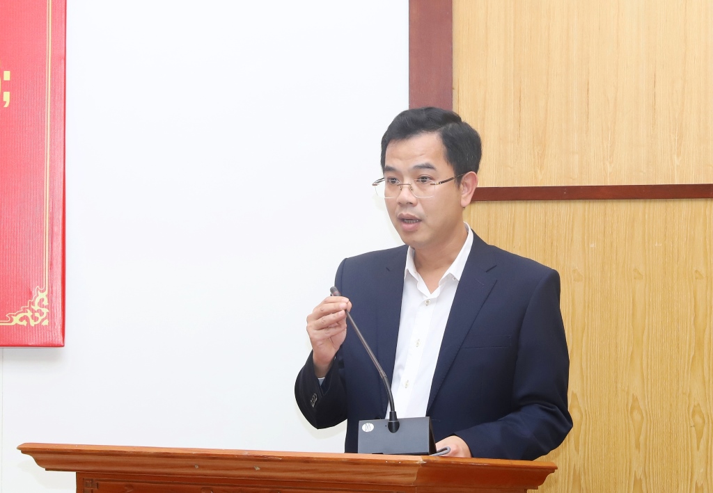 | Phó Chánh Văn phòng UBND tỉnh Lê Việt Hiếu phát biểu tại hội nghị. |